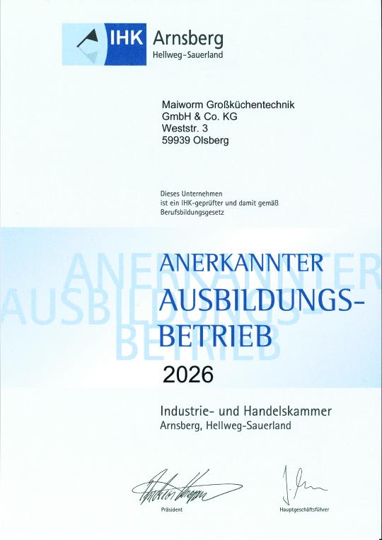 Maiworm wurde, wie viele andere Betriebe auch, in diesem Jahr von der IHK Arnsberg als "anerkannter Ausbildungsbetrieb" ausgezeichnet. "Sie engagieren sich nach wie vor durch Qualifizierung für die nachhaltige Sicherung des Fachkräftenachwuchses in der Region Hellweg-Sauerland", schreibt die IHK als Begründung für die Auszeichnung.